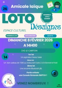 LOTO de l’Amicale Laïque + Ajouter à mon Agenda Google + Exporter vers iCal 00 jours 00 heures 00 minutes 00 secondes Date 8 Fév 2026 Heure 14h00 - 14h00 Catégorie EVENT Partagez cet événement
